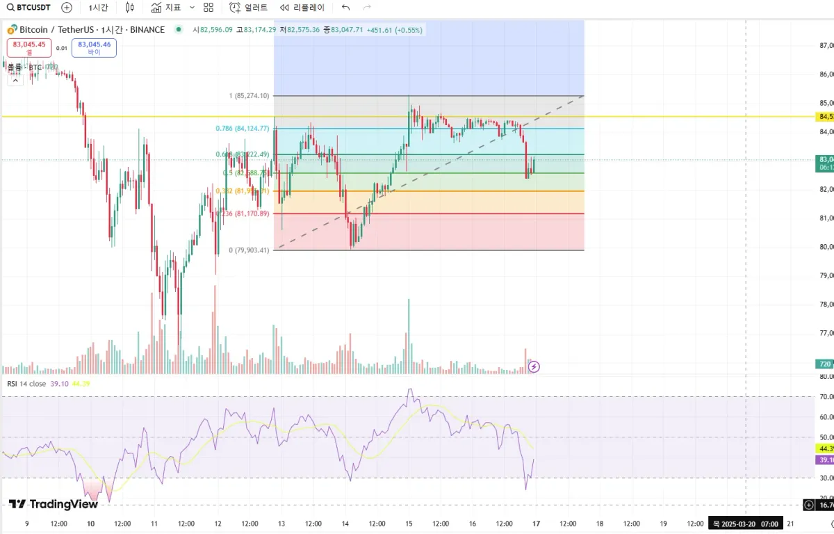84,500을 뚫었을 때 long으로 진입하였으나, 과매수 구간이었고 그 이후 하락하여 약간의 손실을 보고 나온 상태입니다.