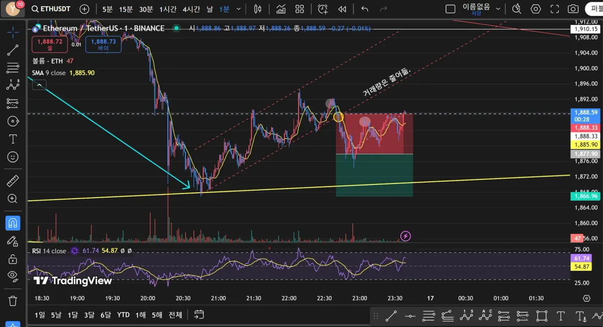 진입한 1877.89를 기준으로 익절가는 플래그 시작부분, 손절가는 동그라미친 부분(플래그 이탈한 구간)으로 설정했는데 결국 로스컷에 걸려 손절로 마무리하게 되었습니다.