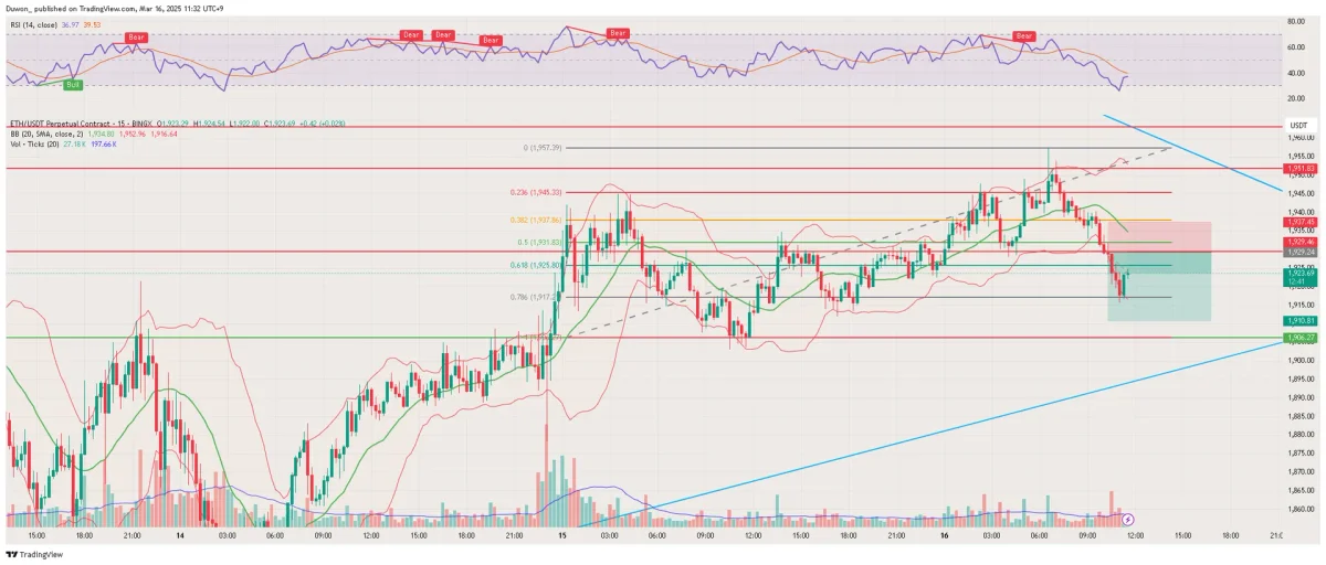 볼밴, 피보나치 적용하였고 추세선과 지지와 저항 작도 후 숏 포지션진행했습니다.