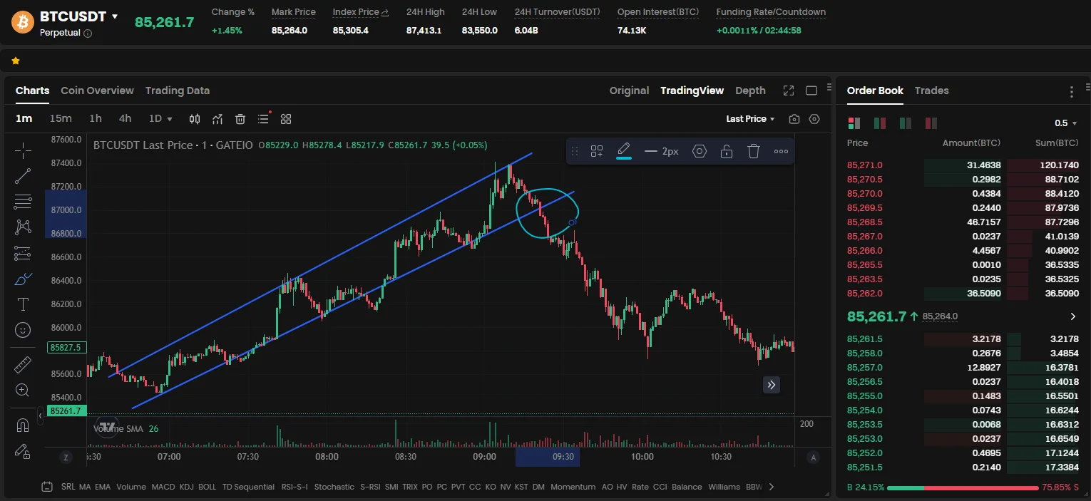 상승 추세선 안에서 결국 아래선을 뚫어주어 상승이 끝나고 하락으로 추세가 변경되었습니다.