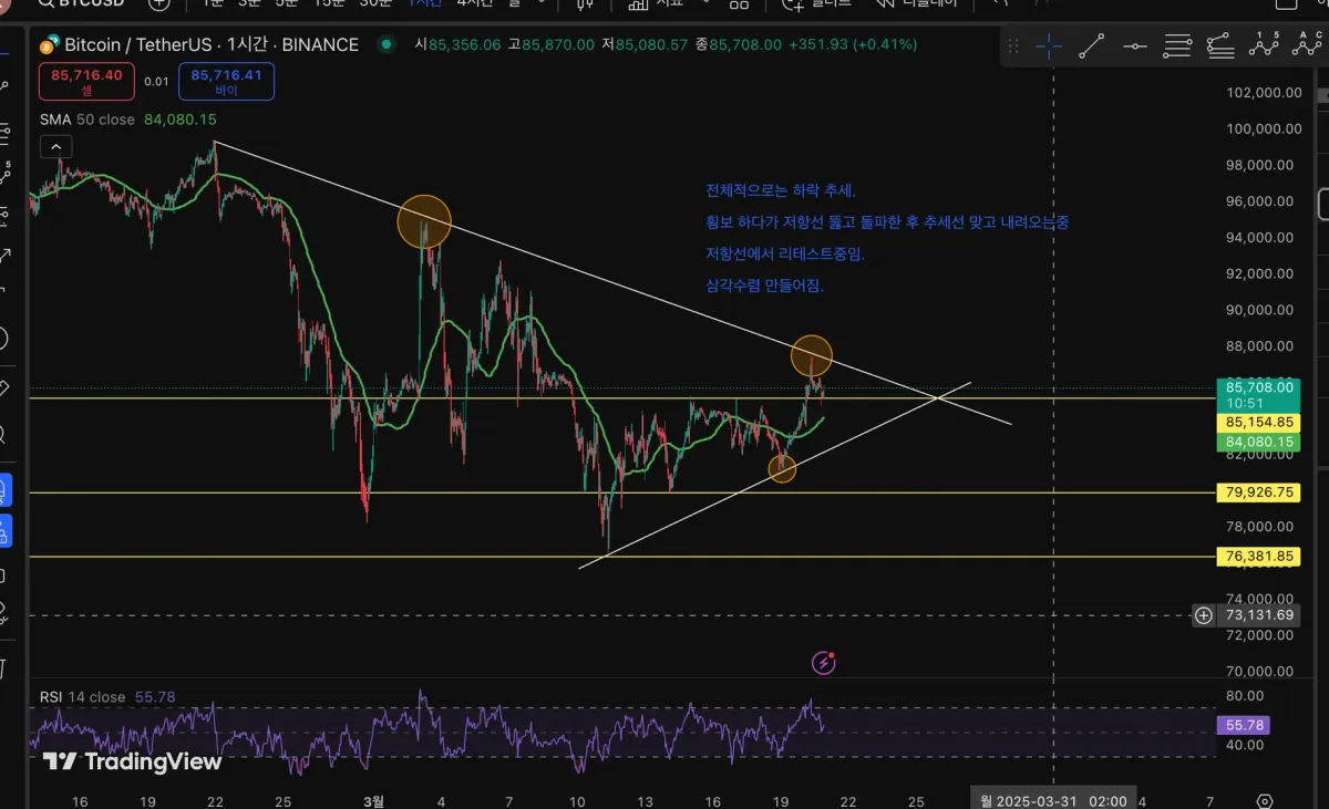떨어진 후 횡보 하다가 저항선 뚫고 돌파한 후 추세선 맞고 내려오는 중입니다.