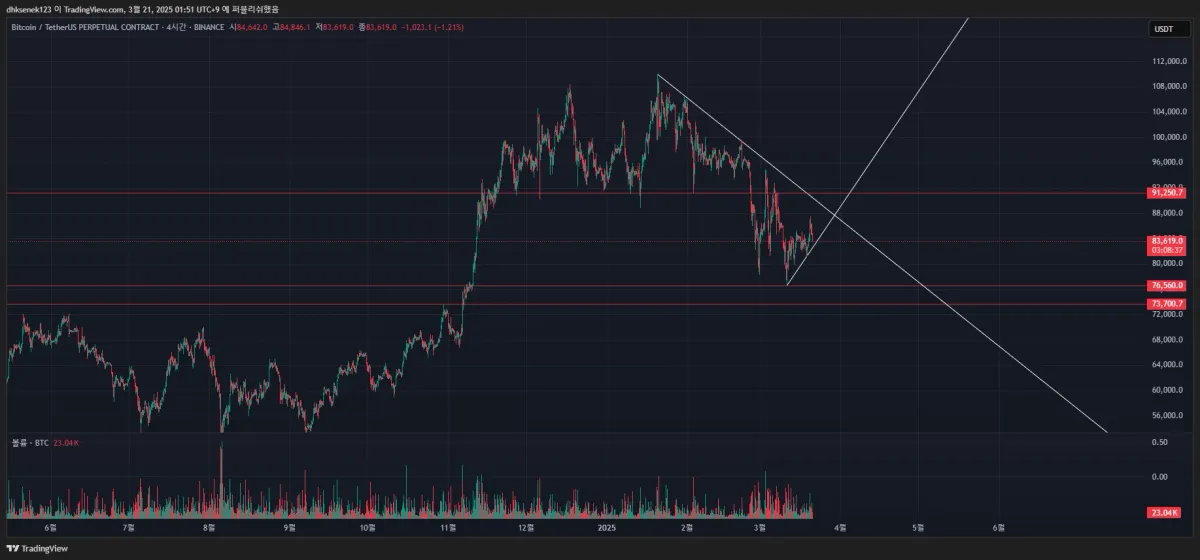 4시간봉에서 상승추세선과 하락추세선을 작도 하였고, 현재 중요하다고 판단되는 지지라인 2곳, 지속적으로 지지해 주다가 뚤린 91k부근의 저항라인을 작도해 보았습니다.