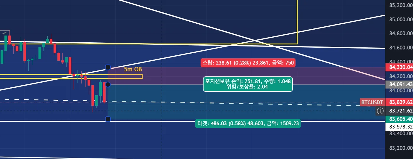 SL :84,4220(이탈한 상승채널을 큰 양봉으로 돌파하여 마감하였을 때, 5m OB 넘어서)
