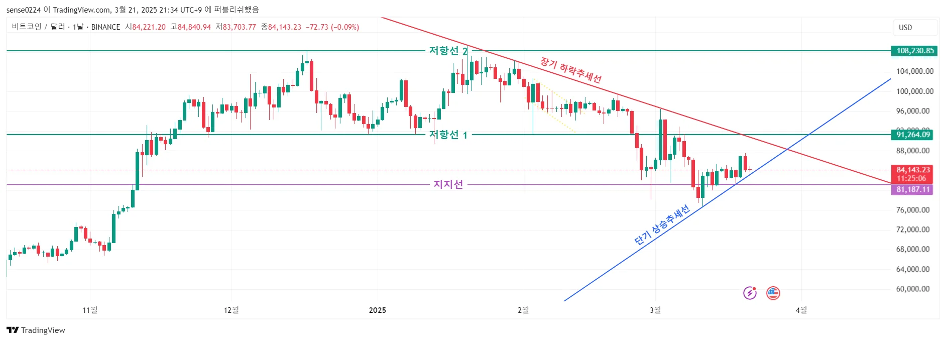 현재 비트 코인(일봉) 기준으로 위로 저항선, 지지선 , 추세선(장기, 단기)로 나누어 작도 해 보았습니다.