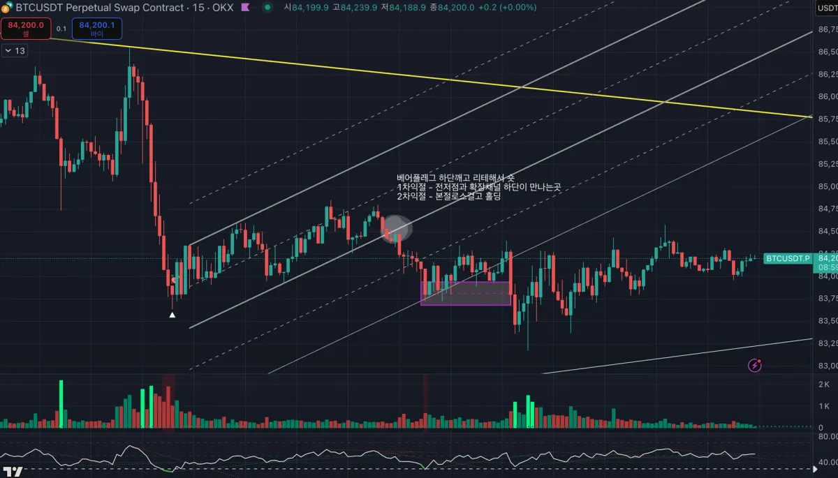 1차익절은 확장채널하단과 전저점이 만나는 지점