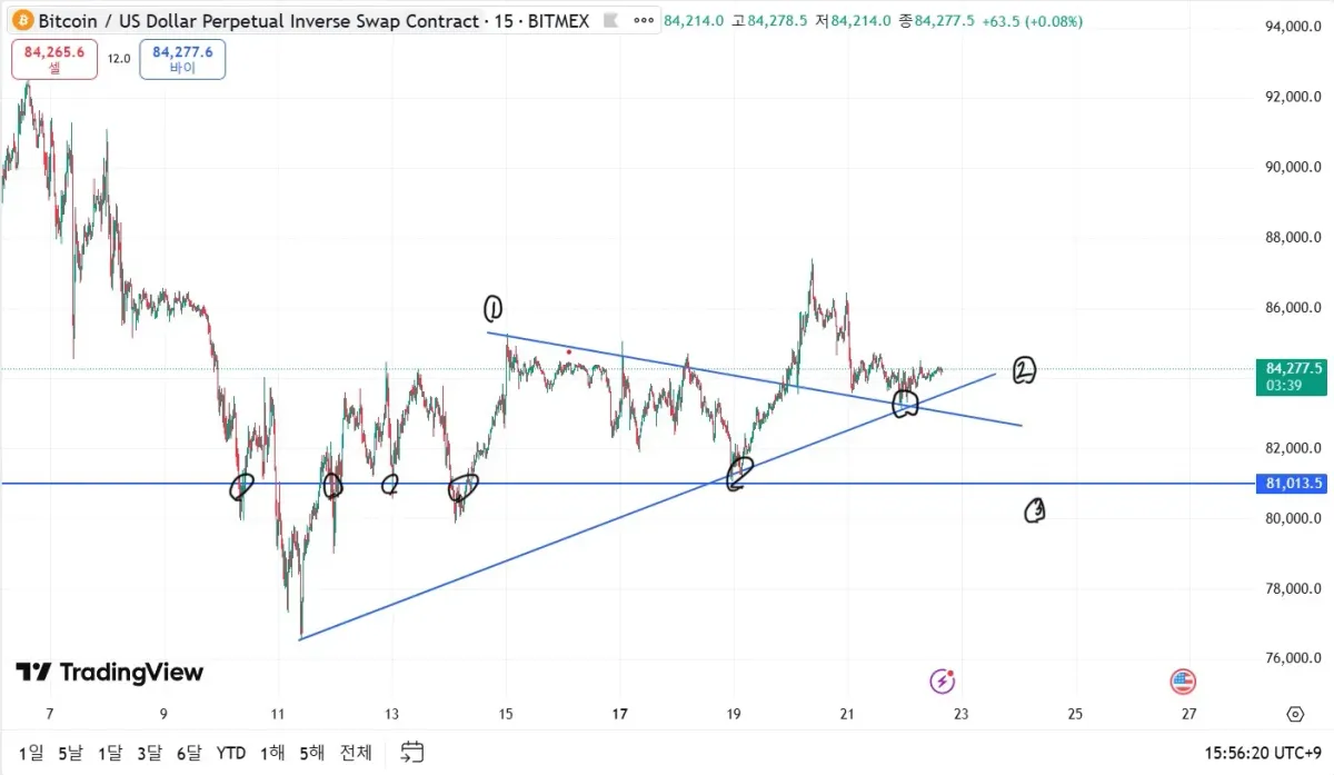 1, 2번 지지선이 돌파될 경우 여러 번 리테스팅된 3번 매물대 구간에서 매수를 고려해 볼 수 있습니다.