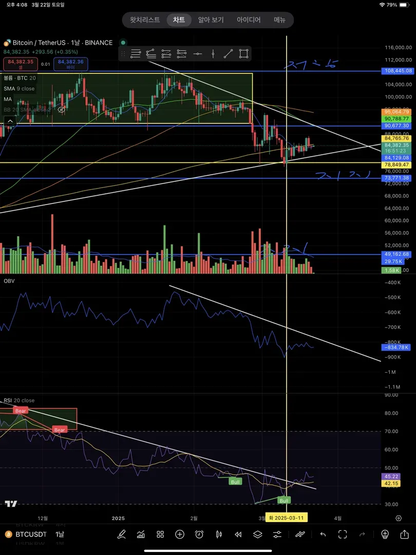 캔들 및 RSI 급락히며 추세선에 닿은 지점 78850선에 매수, 익절은 저항선 근처에서 매수세 보고 결정 손절은 지지선입니다