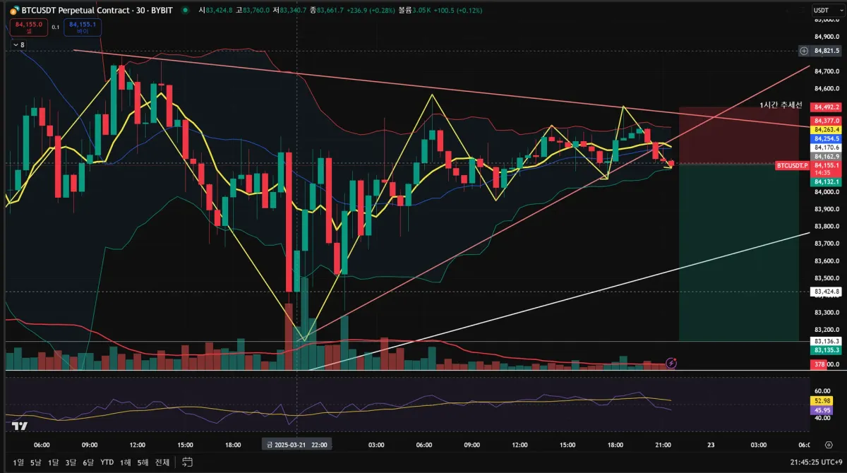 1시간 추세선 작도한 결과 삼각수렴 형태가 나왔으며 배물대 지지 저항선 이탈 아래 추세선에 지지를 받았으나 고가 추세선 저항으로
