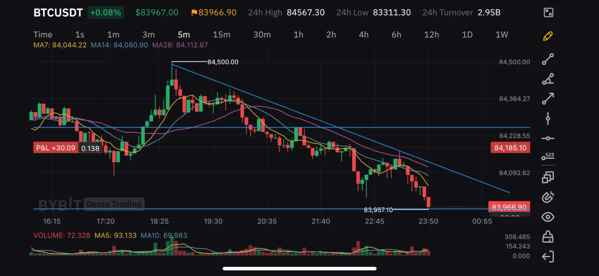 추세선과 지지,저항선을 그어보고 5분봉에서 진입했습니다.