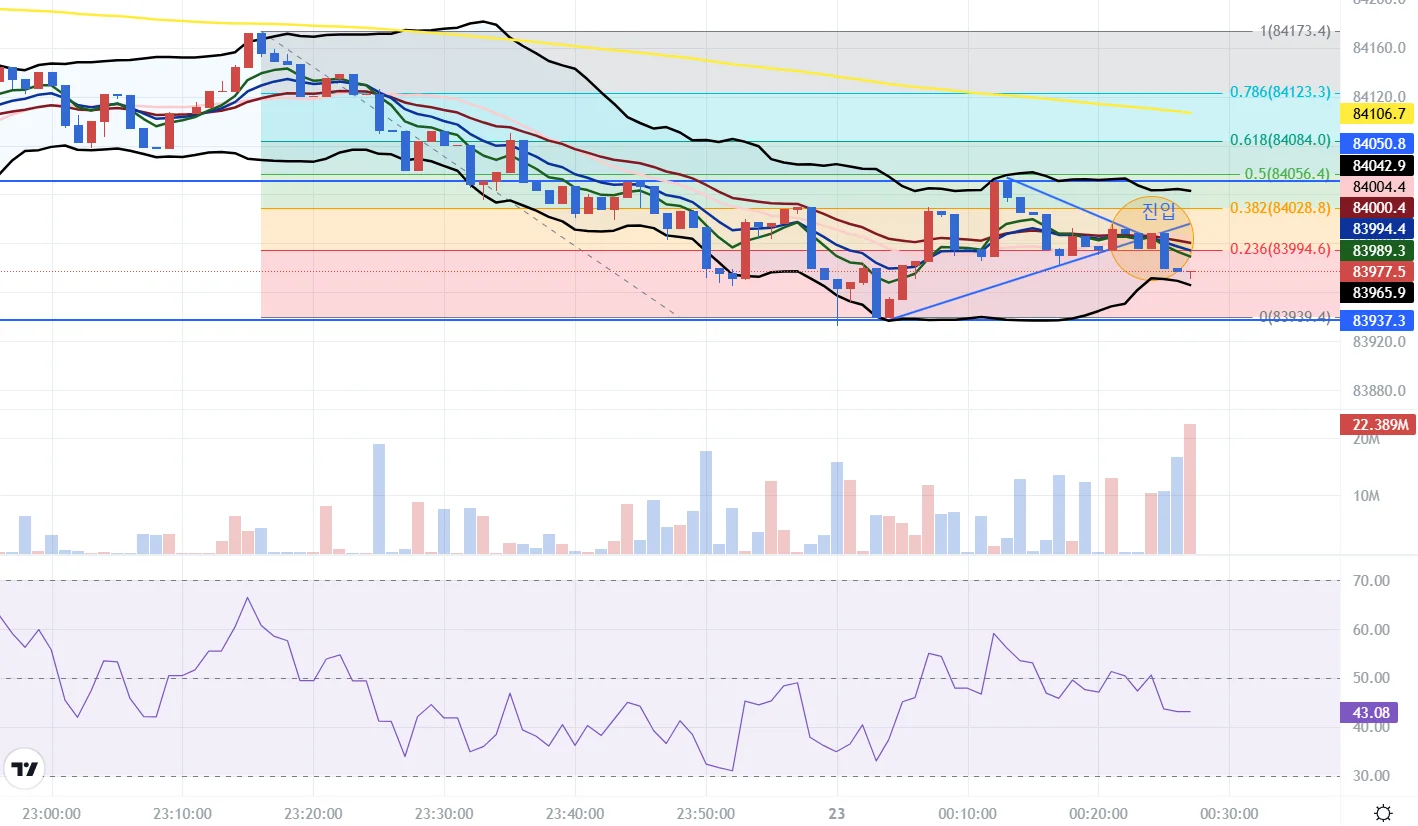 삼각수렴 하방돌파 나오고 리테스트 보고 84007 진입해서 83972 짧먹했습니다.