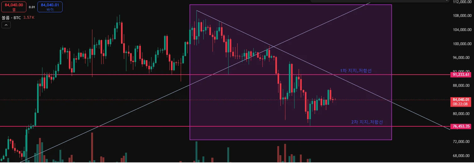 추후 추세선 및 1차 저항선을 돌파하지 못하는 상황이 발생할 경우 2차 지지선을 뚫고 68,000도 위험한 상황이 연출 되어 극심한 공포국면으로