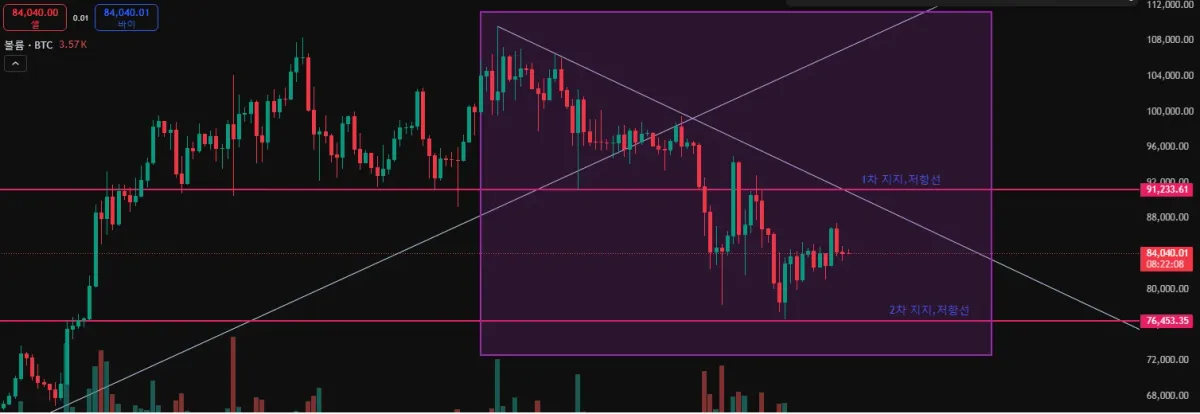 추후 추세선 및 1차 저항선을 돌파하지 못하는 상황이 발생할 경우 2차 지지선을 뚫고 68,000도 위험한 상황이 연출 되어 극심한 공포국면으로