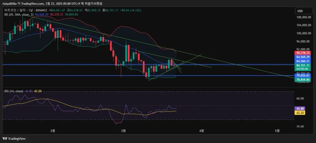 1일봉 4시간 봉 1시간봉을 추세선과 볼린저밴드 rsi수치 삼각수렴 관찰 인지 = 추가적인 상승 예상