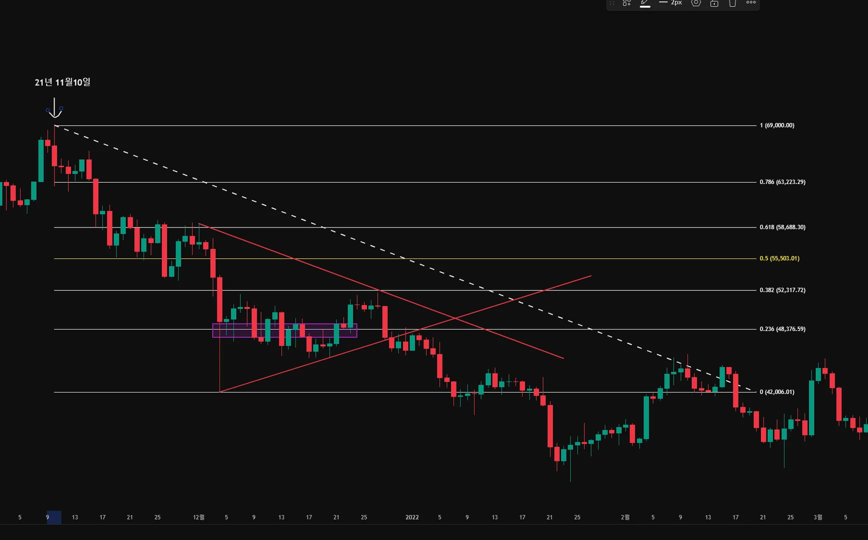 올해와 동일하게 236라인에서 강한 지지와 저항을 받으며 횡보 이후 382라인 못미치는 반등이후 삼각수렴 이탈하며 강한 하락을 한 것으로 보입니다.