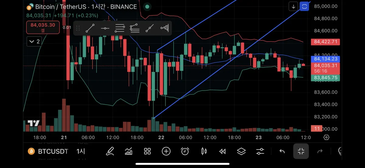 추세선과 20이평선에 지지 받고 올라가는 그림을 생각하며 진입했는데 뚫고 내려갔습니다. 거래량이 낮아 휩소일 수 있을거라 생각해서 가지고 가다가 말아올리지 못하고 추세 하향 이탈하는 것을 보고 손절했습니다.