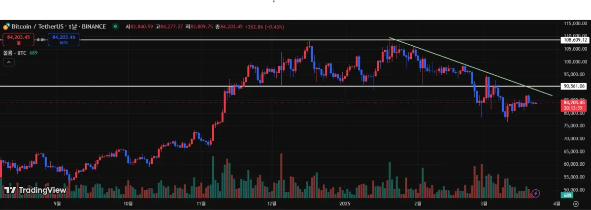 108,609 위에 저항과 90,561 지지를 받고 있다가 지지받지 못한 후 가격이 하락 추세선을 뚫지 못하고 계속 하락하고 있음
