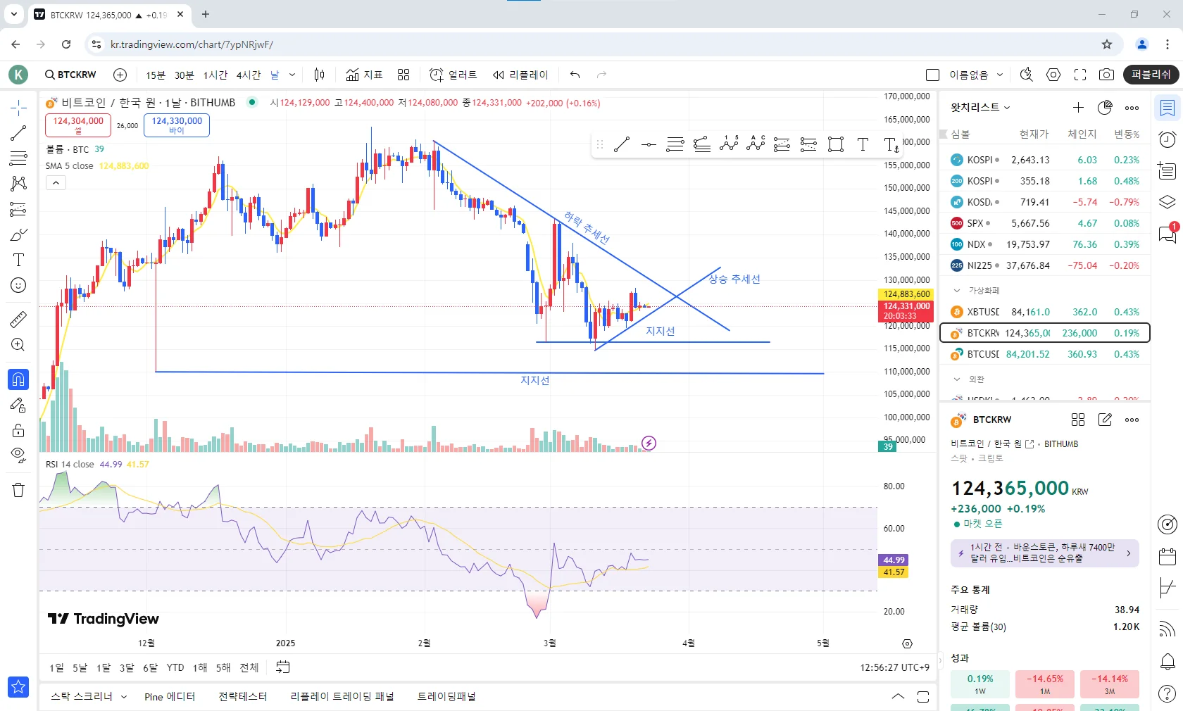 먼저 실습강의에서 강사님께서 설명을 해주신 작도법 중에서 꼬리가 긴 구간이 유의미한 구간이라고 말씀하셔서 꼬리가 긴 구간을 지지선으로 잡았습니다. 그리고 하락이 시작된 고점을 기준으로 하락세를 이어가다 추세선에 닿고 하락 추세를 계속 이어가고 있습니다. 그러다 제가 또 다른 긴 꼬리 구간을 저점으로 잡고 지지선을 하나 더 그었습니다. 그리고 그 지지선의 지지를 받고 미세하게 상승중 인것 같아서 상승 추세선도 같이 그려보았습니다. 앞서 강의에서 삼각수렴에 대해서 정확하게는 모르지만 대략 삼각수렴과 비슷한 그림이 나온것 같습니다. 그러므로 앞으로 횡보하거나 상승할 것 같습니다.