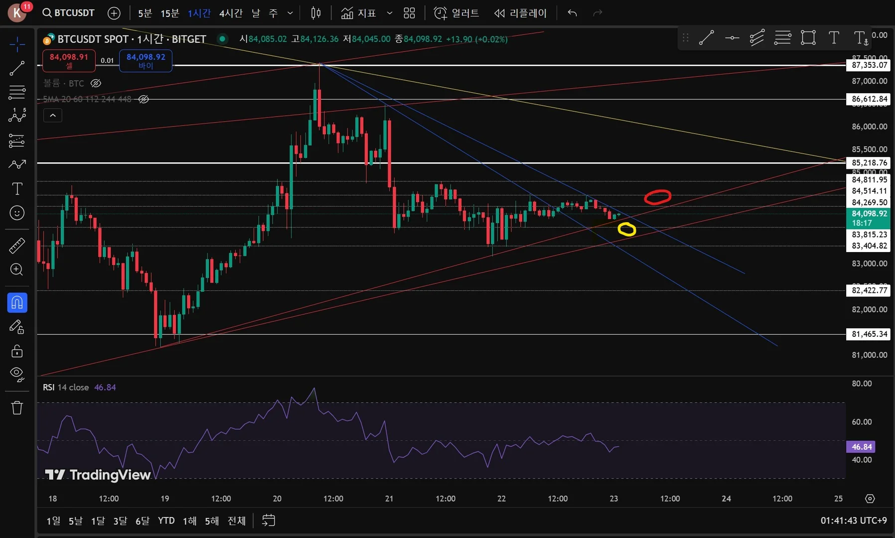 한 시간봉으로 단기 추세선 잘 지켜주는 것 같아서 진입했고요, 노란색 동그라미 친 지지선 깨면 손절하고 빨강색 저항선에서 익절로 들어갔는데 손절 되었습니다.