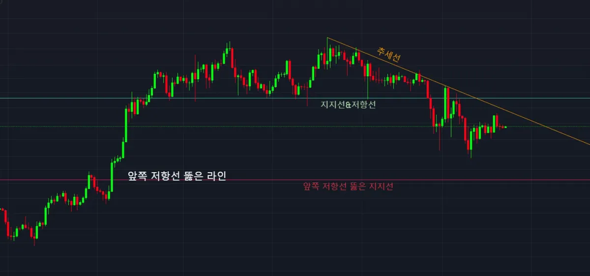 지지선이 뚫려 저항선으로 바뀐 거 같고 앞쪽 저항선 뚫은 자리가 지지선이 될 거 같습니다.