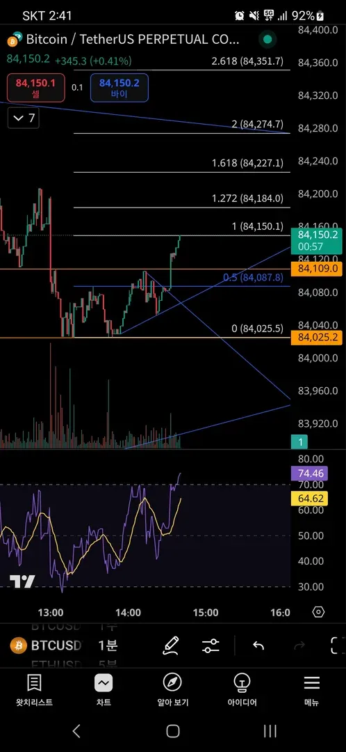 비트코인 1분봉 더블바텀형성 및 넥라인 돌파 확인 후 진입.