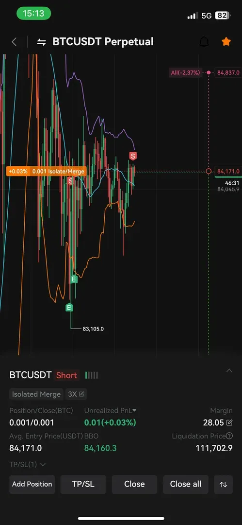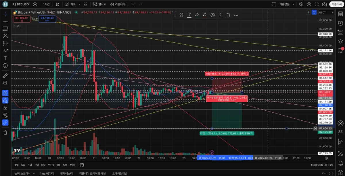 고점과 저점이 점점 낮아지는 것으로 보아서 단기 하락추세로 생각되어 84,172 부근을 저항선과 15분봉 차트에서 작도한 추세선이 만나는 지점에서 진입하였습니다.