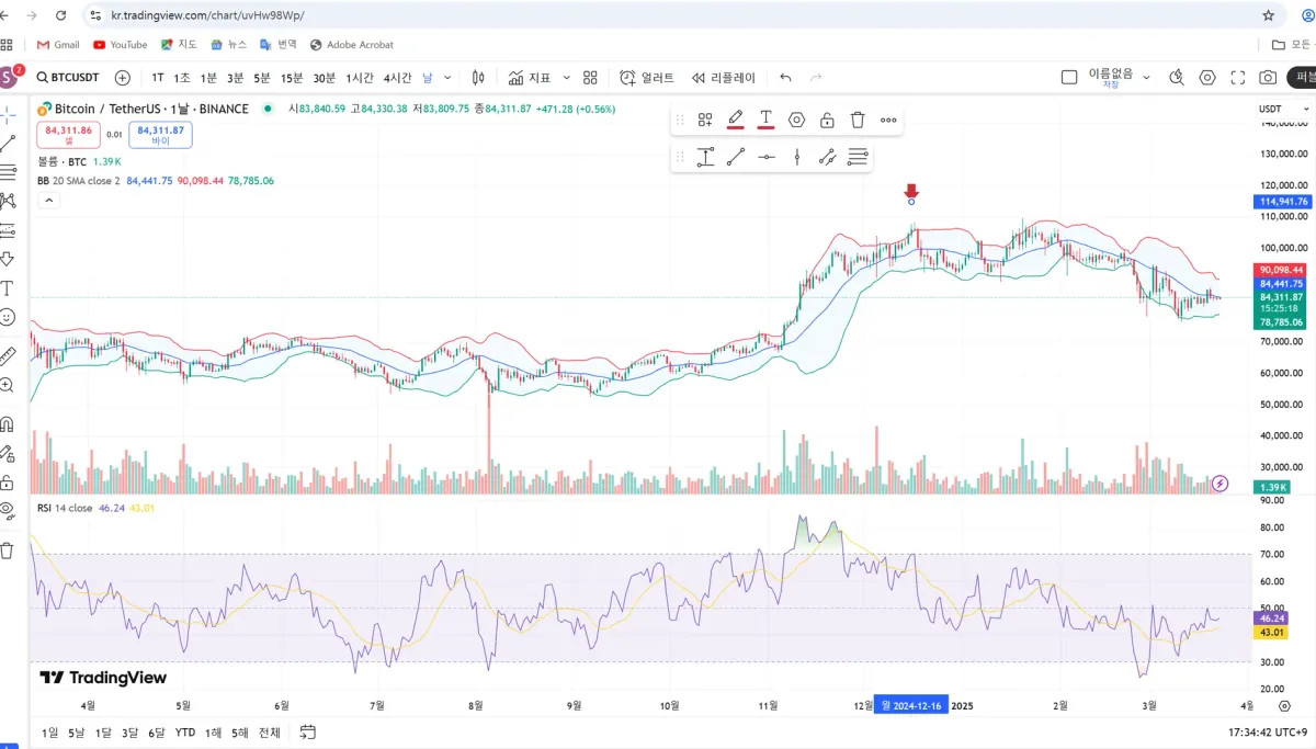 볼린저 밴드와 RSI지수를 같이 지표에 추가하여 흐름 확인 하였습니다