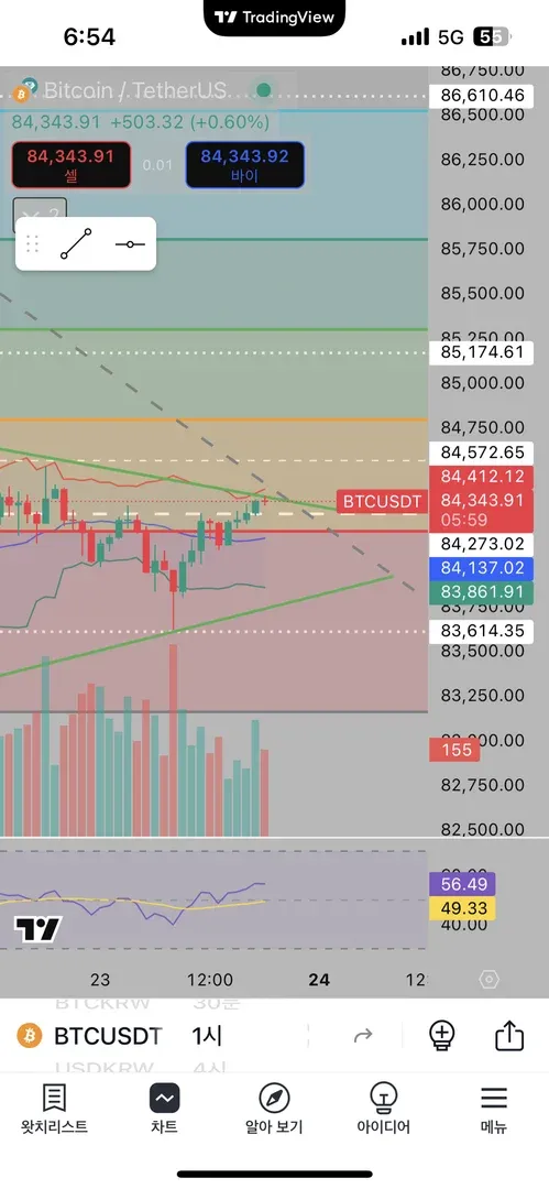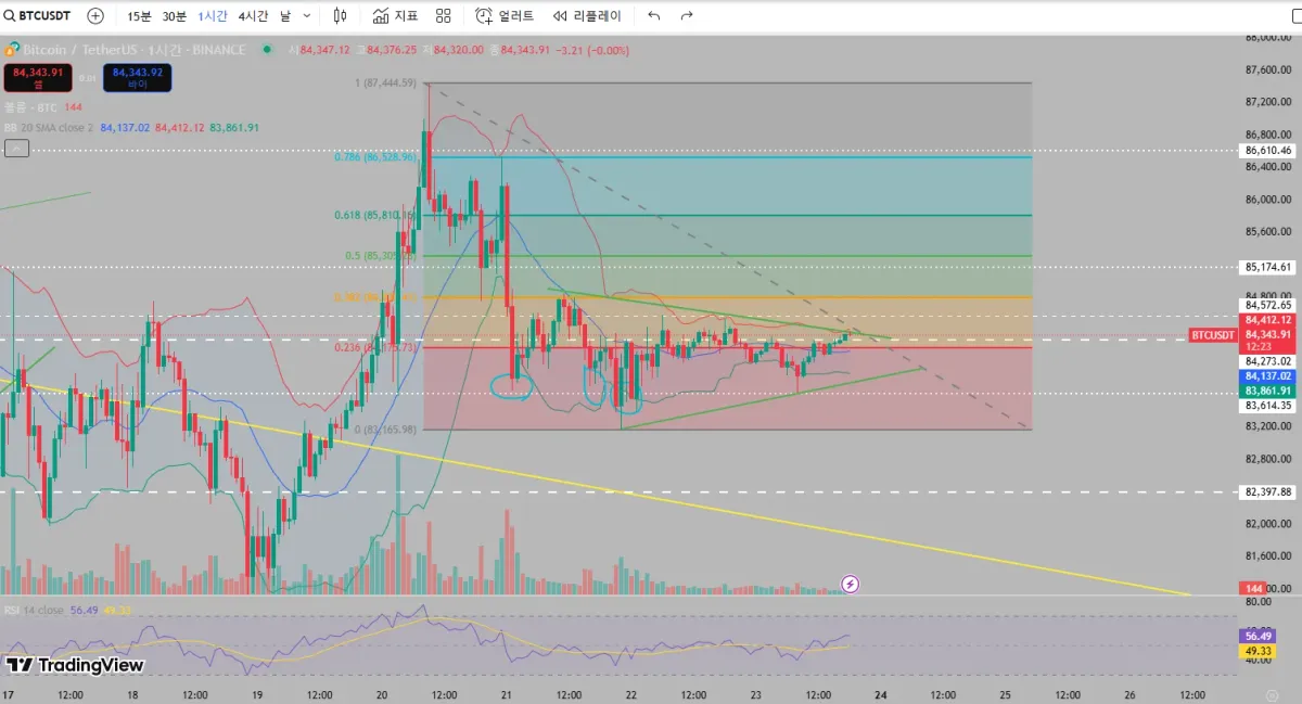삼각수렴 패턴도 뒤늦게 발견 됐는데 나중에 이탈했을때 리테스트후 방향에 맞게 롱 혹은 숏으로 다시 진입할 예정입니다