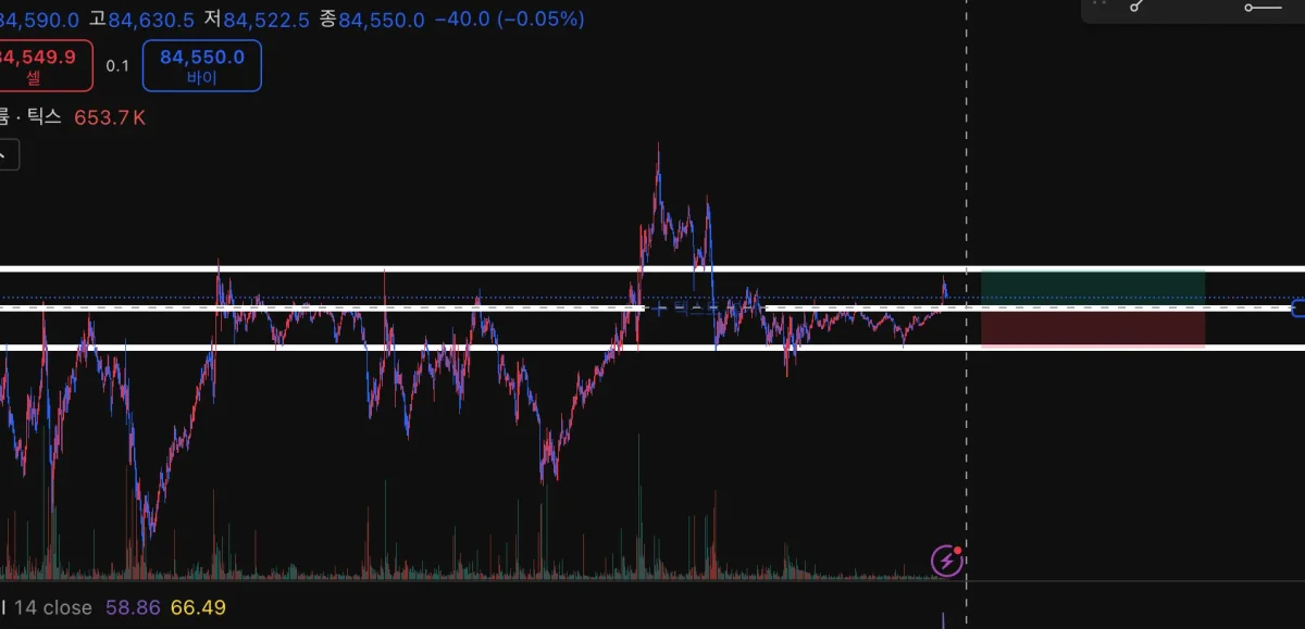 15분봉 기준으로 횡보 중인 상태입니다. 의미 있는 저항선 돌파 후 눌림목 발견하였는데 중간 지지선 터치 후 상승할 것으로 판단하고 도달 시 매매한 후 상단 지지선에서 익절하겠다는 판단입니다.