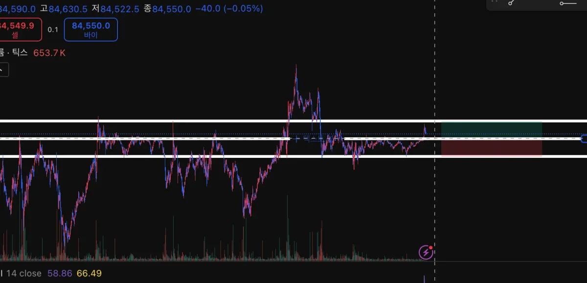 15분봉 기준으로 횡보 중인 상태입니다. 의미 있는 저항선 돌파 후 눌림목 발견하였는데 중간 지지선 터치 후 상승할 것으로 판단하고 도달 시 매매한 후 상단 지지선에서 익절하겠다는 판단입니다.