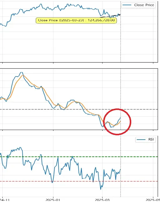 만약 RSI가 40이상이면서 MACD가 0 근처 마이너스 값에서 플러스 값으로 상승할 때까지 기다려서 매수할 예정입니다.