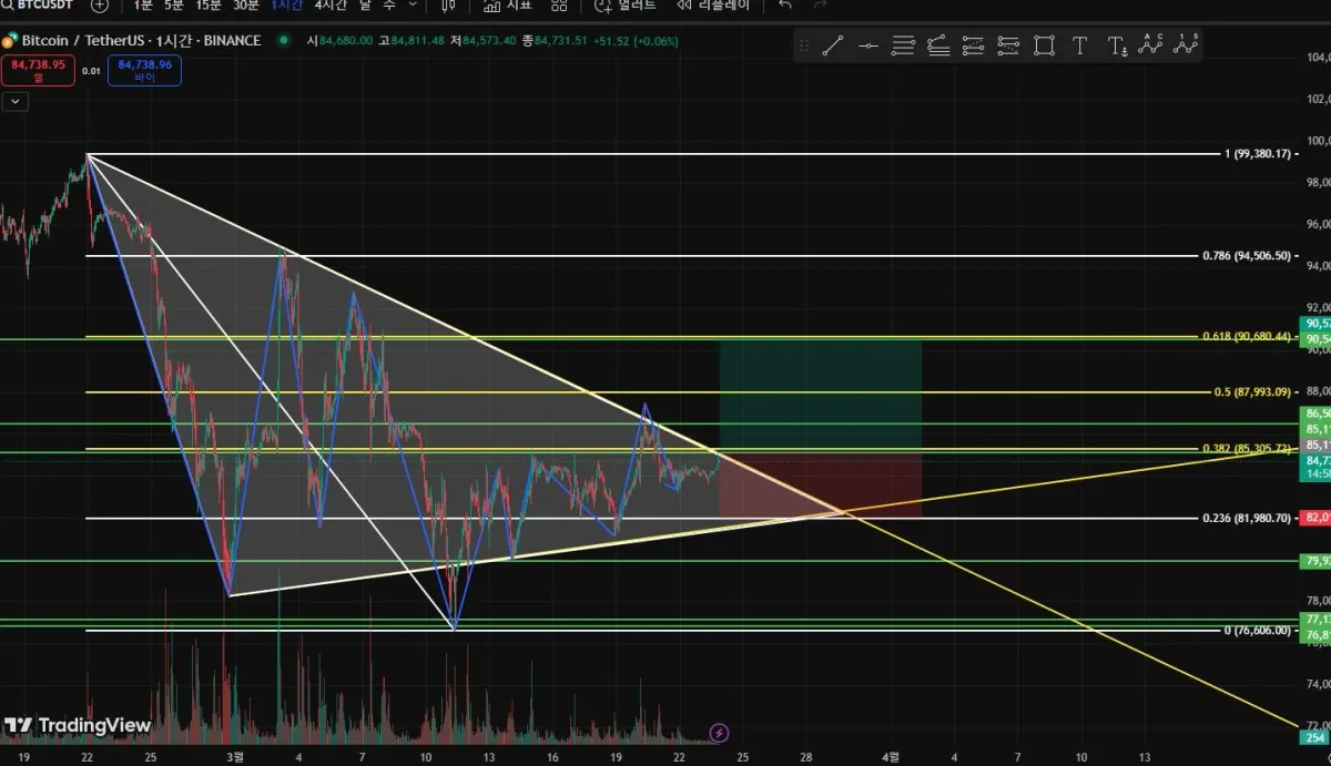 삼각수렵하다가 고점 저점을 올리고 있는 거 같습니다. 롱포지션진입으로 되돌림으로 0.236선 손절라인 잡았고