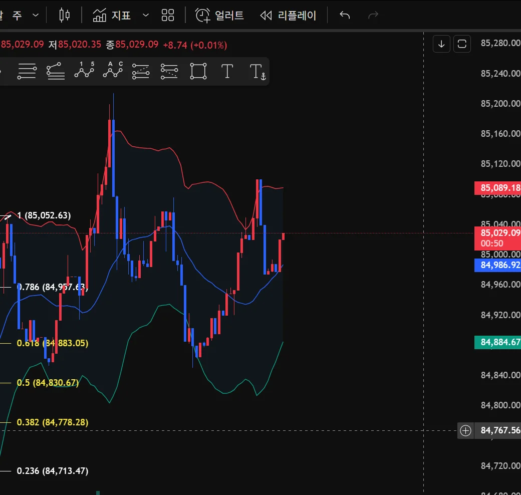 1분 단위로 보았을때 현재로서는 횡보하는 상황으로 보여져 볼린저 밴드 내 지지저항선 사이 거래를 하고자 하였습니다.