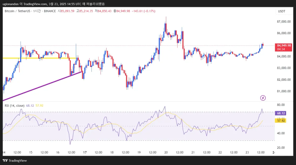- 3월 19-20일경에 87,000 USDT 부근까지 급등했다가 조정을 받은 후, 현재 다시 반등하는 모습입니다.