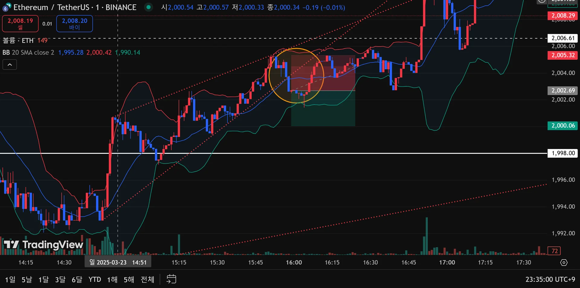 최종 1분봉 차트를 보고 상승쐐기형 패턴이라 보고 아래 추세선을 하방이탈하면 숏으로 진입해야겠다 생각했고, 확실하게 뚫었다 판단해 동그라미친 곳에서 진입했습니다.