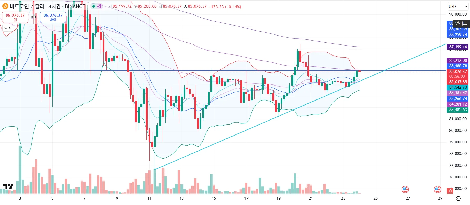 - 예전에 그어놨던 지지저항선인 85100~85200 부근을 트라이하지만 못뚫는 모습