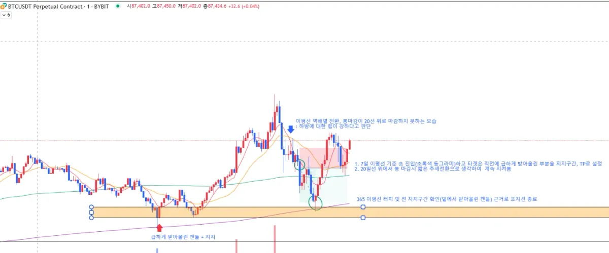 포지션은 이평선 배열과 캔들 모양을 근거로 진입하였습니다.
