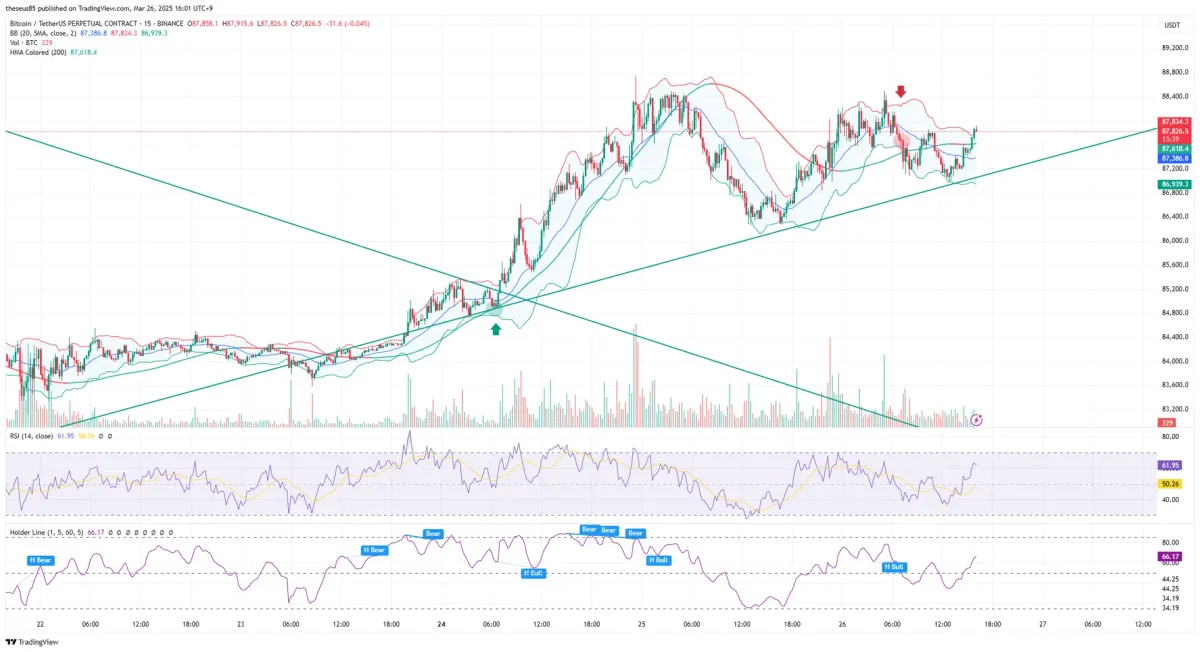 - 비트코인 상승 중, 삼각 수렴 패턴 포착.