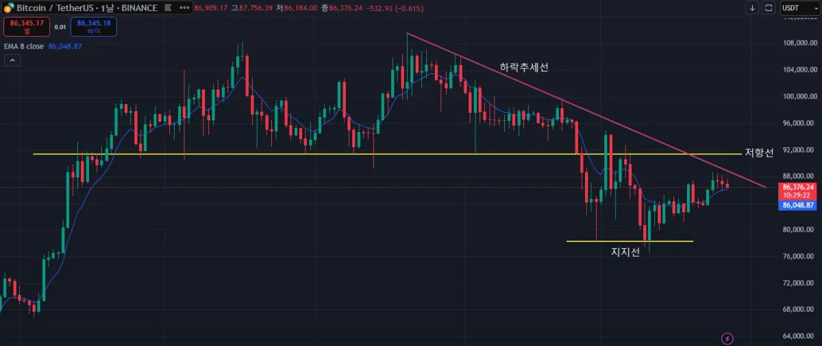 78K 부근 지지선이 형성되어 있고 이를 기점으로 일시적인 상승이 형성되어 있으나 하락추세선 부근에서 부딪혀 내려오고 있는 상황이다.
