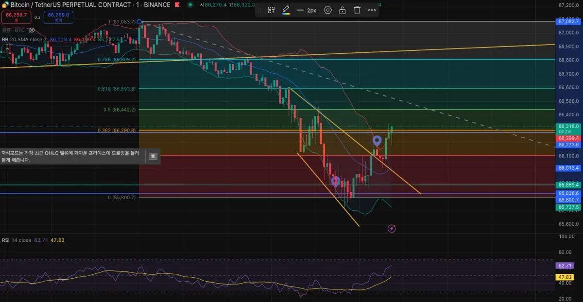 볼린저 하단 이탈 + RSI 과매도 구간 진입하여 중간 이평선 크기만큼 아래로 손절라인 잡고 볼린저 상단에서 성공적으로 익절하였습니다.