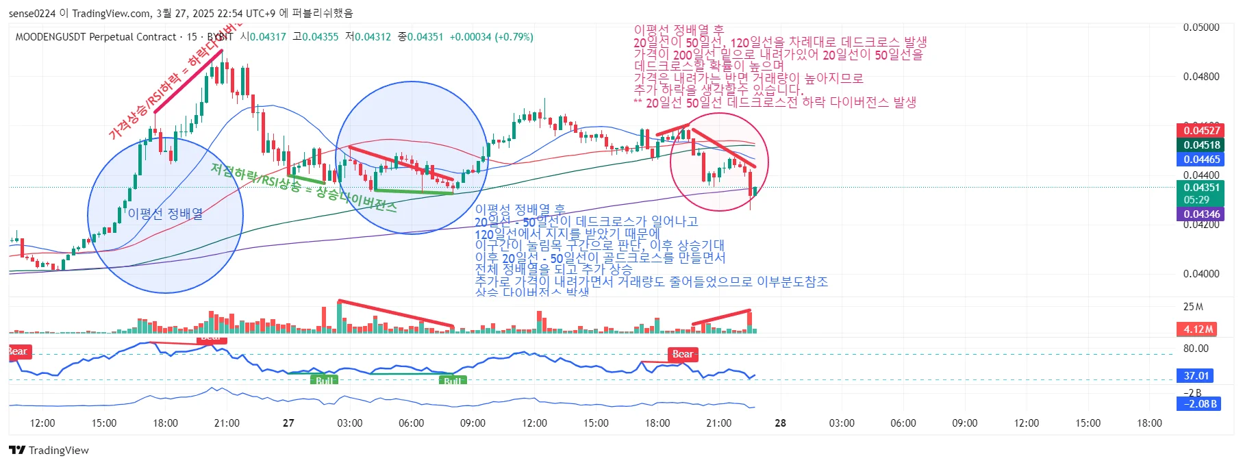 RSI 보조지표, OBV보조지표, 이동평균선을 추가하고 지금까지 배운 내용중