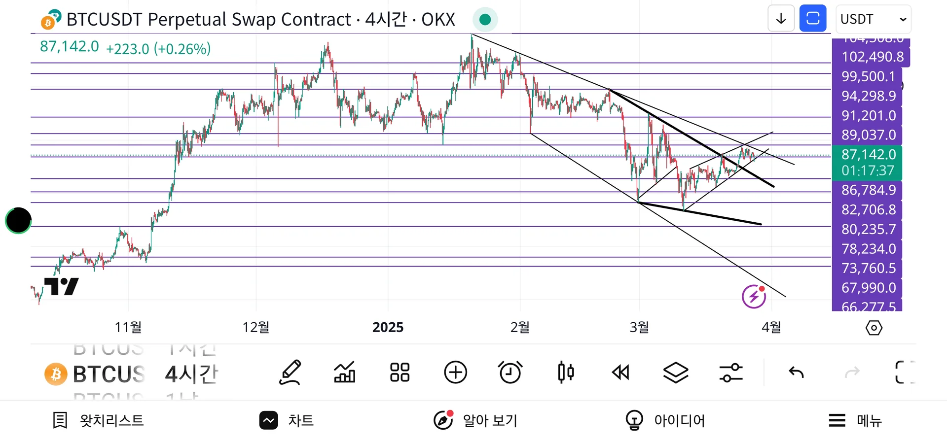 비트코인 4시간봉 지지저항과 추세선 작도했습니다.