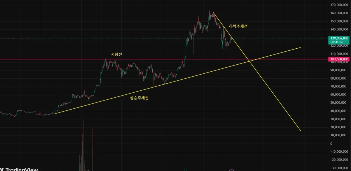 장기적으로 보면 상승추세선에 해당하나, 단기적으로 보면 하락추세선을 그리고 있다고 생각합니다.