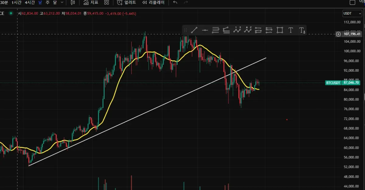 비트코인 일봉 차트에서 상승 추세선을 잘지켜 오다가 25년 2월 25일 상승 추세선에서 이탈한 모양입니다.