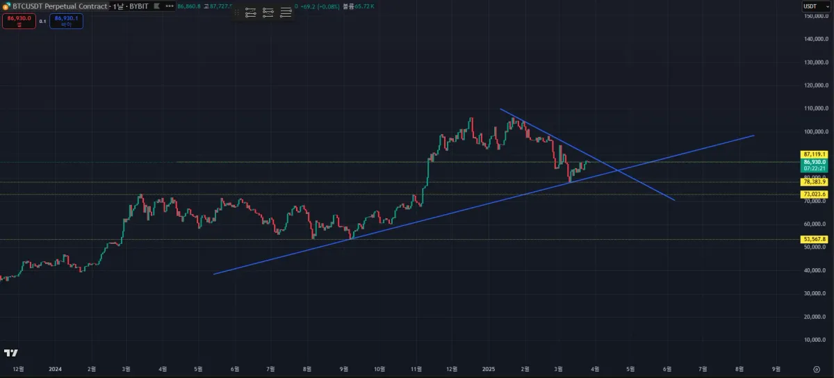 가로선을 볼 때 밑에서 부터 1,2,3,4번이라고 칭하겠습니다. 제일 밑의 1, 2번 가로선 채널 안에서 약 10개월 정도 횡보를 한 후 강한 상승을 동반한 힘으로 채널을 뚫어주었고, 곧바로 87k에 안착했습니다.