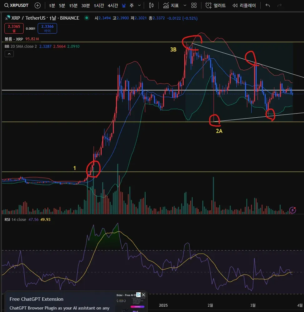 2,3번이 고점에 있는 지지선이면서 저항선 역할을 하는 것이라고 봅니다.