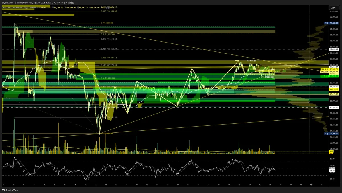 현재는 89205를 터치 후 95000까지 가서 추세를 전환시킬 수 있을 더 많은 근거들를 확보할 수 있을지 여부를 지켜봐야 할 것 같습니다.