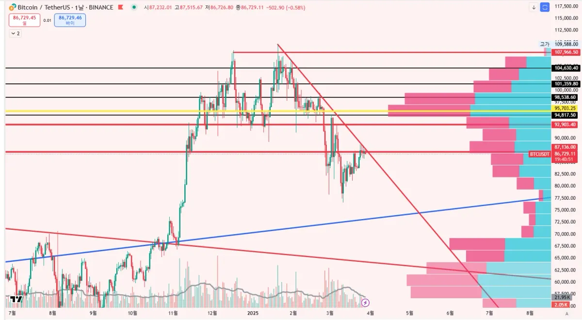 비트코인 일봉차트입니다. 빨간색은 유의미한 지지와 저항선이고, 빨간색 대각선은 하락추세선, 파란색은 유의미한 상승추세선입니다.