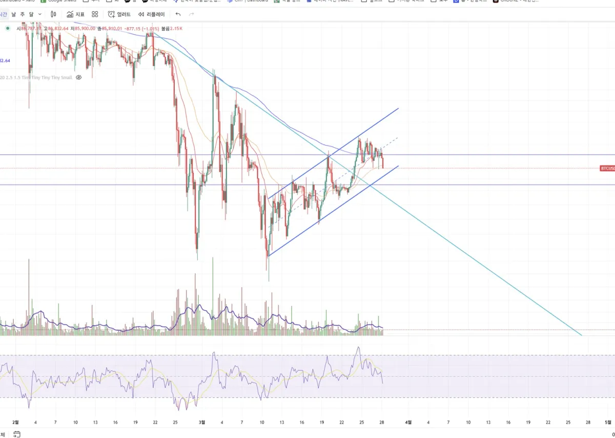 지지/저항선은 이전의 변곡점으로 보이는 고점으로 잡아봤습니다.