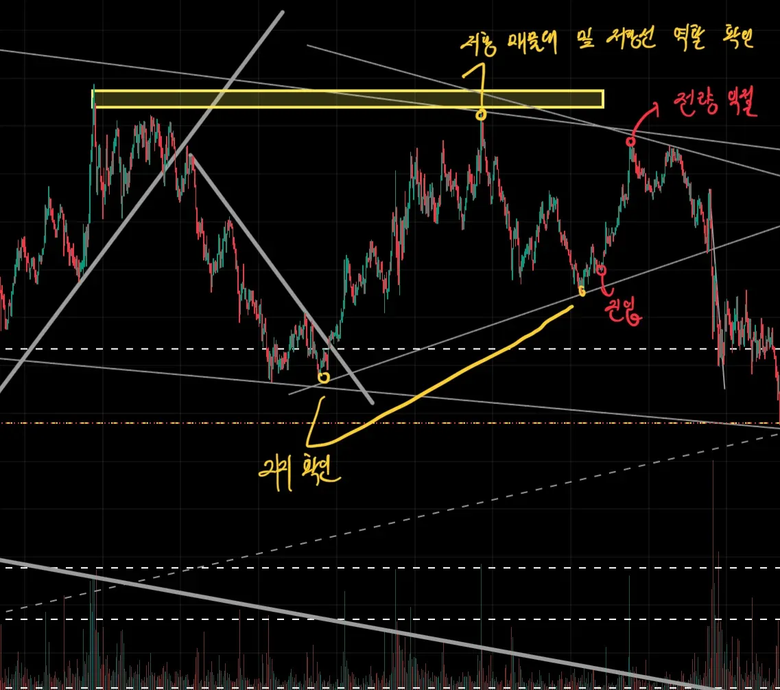 저항선, 저항매물대가 기능하는 것과 지지선이 기능하는 것을 확인한 후, 25배 롱을 진입하였습니다. 손절은 직전 저점으로 잡고 익절은 저항선에 닿을 때 즈음으로 잡아놨습니다. 생각했던 것이 질 맞아 떨어져 익절에 성공할 수 있었습니다!