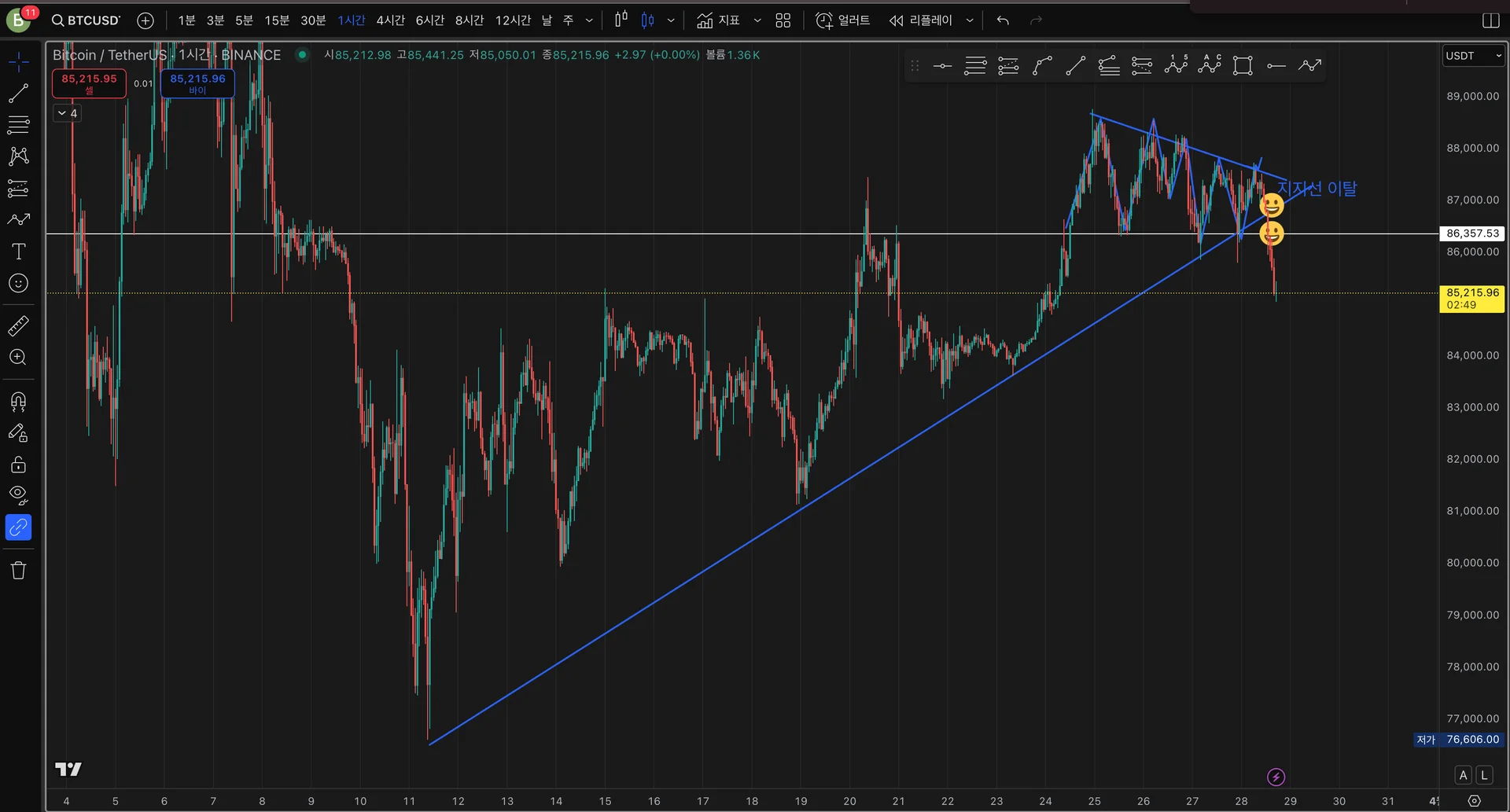 1시간봉 76000에서 추세선그었는데 오늘 추세선 이탈과 나스닥 4시간봉, 비트코인 4시간봉 비교한 결과